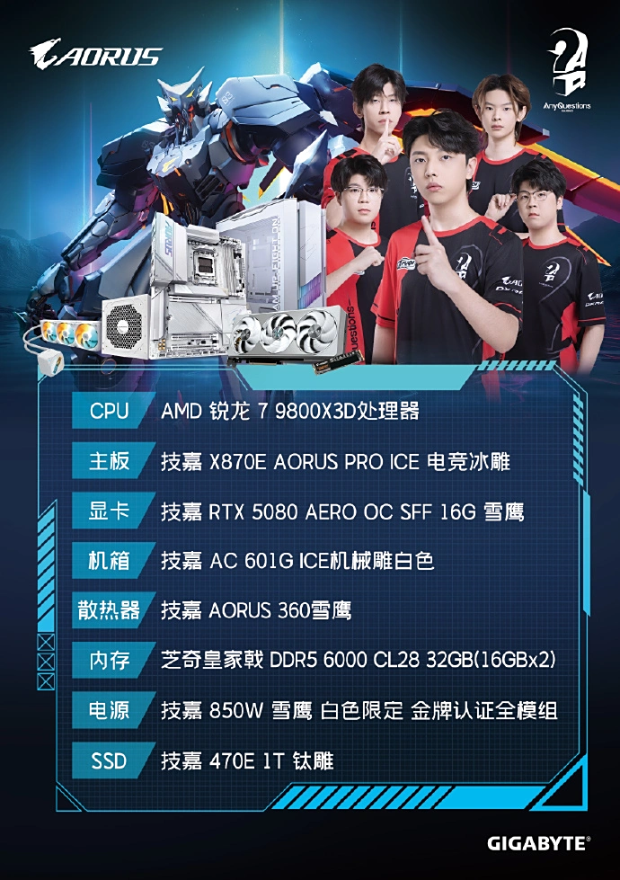 AQ 战队(无畏契约职业战队):获赠全队定制主机,核心配置涵盖 AMD 锐龙 7 9800X3D 处理器、X870E 电竞冰雕主板及 RTX 5080 雪鹰显卡,针对团队竞技场景优化硬件协同性,确保战队成员在训练与比赛中获得一致的高性能体验,全“嘉”桶 BUFF 加持,助力超神发挥!